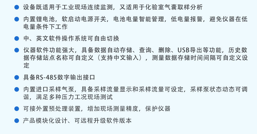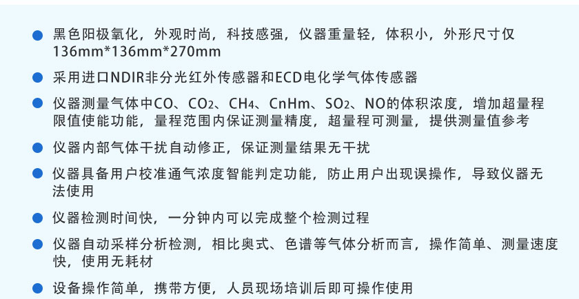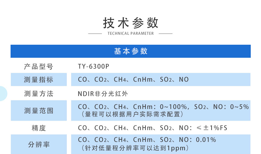 CO、CO2、CH4、CnHm、SO2、NO:0.01%(針對(duì)低量程分辨率可以達(dá)到1ppm) |