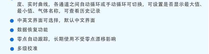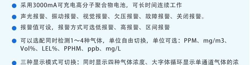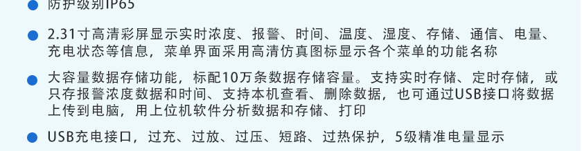 采用2.31寸高清彩屏實時顯示濃度,最多可以同時檢測1~4種氣體,具有大容量數據存儲功能,選用知名品牌的氣體傳感器,主要檢測原理有:電化學、紅外、催化燃燒、熱導、PID光離子。