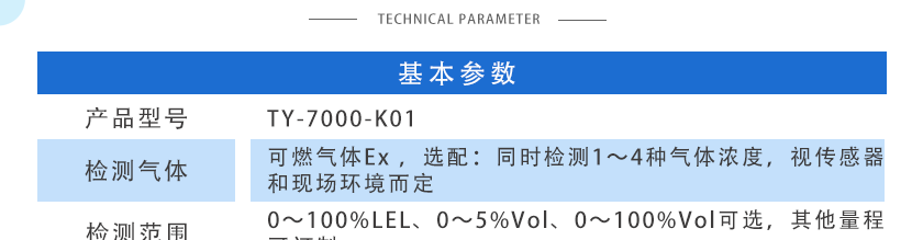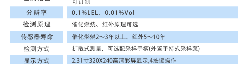 0~100%LEL、0~5%Vol、0~100%Vol可選,其他量程可訂制