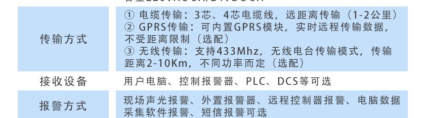 ①電纜傳輸:3芯、4芯電纜線,遠距離傳輸(1-2公里)②GPRS傳輸:可內(nèi)置GPRS模塊,實時遠程傳輸數(shù)據(jù),不受距離限制(選配)③無線傳輸:支持433Mhz,無線電臺傳輸模式,傳輸距離2-10Km,不同功率而定(選配) |