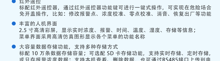 CO(0~1000ppm)、H2S(0~100ppm)、O2(0~30%Vol)、Ex(0~100%LEL),其他量程可訂制