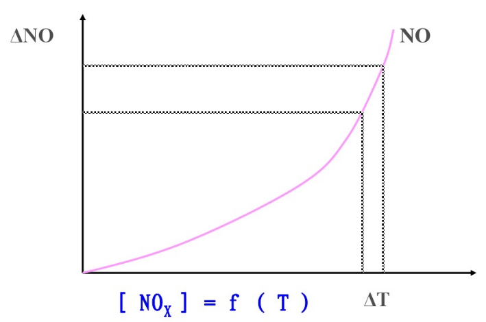 水泥熟料在煅燒過程中,會產(chǎn)生大量的NO,NO的形成主要取決于:火焰情況;燒成帶原料的溫度;火焰中氧含量;二次空氣與火焰的混合;鈣和堿性硫酸鹽的數(shù)量。而窯內(nèi)煅燒溫度也與這些因素相關(guān),故NO含量與窯內(nèi)煅燒溫度成一定關(guān)系,其關(guān)系曲線如圖1。