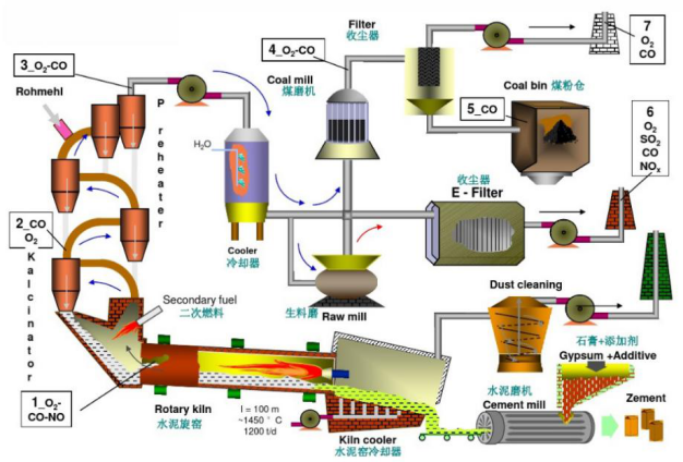 目前水泥廠回轉(zhuǎn)窯干法生產(chǎn)線從日產(chǎn)1000噸到日產(chǎn)10000噸工藝技術(shù)已非常成熟,在全國各地已廣泛推廣應(yīng)用。為提高水泥廠回轉(zhuǎn)窯干法生產(chǎn)線的生產(chǎn)效益,各種新技術(shù)相繼在不同的生產(chǎn)線上示范應(yīng)用,譬如在線氣體分析系統(tǒng),具體到富氧燃燒技術(shù),分解爐分級燃燒脫氮技術(shù),燃燒系統(tǒng)的自動化控制技術(shù)等都成為行業(yè)謀求減少水泥工業(yè)污染降低企業(yè)生產(chǎn)成本的一個個突破口,但都因各自的種種因素限制了節(jié)能效果的進(jìn)一步提高和實際應(yīng)用的廣泛推廣,那么在線氣體分析系統(tǒng)的應(yīng)用在水泥廠中是如何運(yùn)用的呢?
