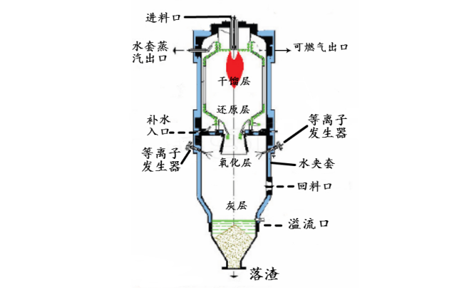 等離子氣化爐中產(chǎn)生的等離子體,由等離子火炬采用380V交流電產(chǎn)生。等離子體的發(fā)生裝置功率在5kW~300kW,溫度可達(dá)4000℃~7000℃,射流速度超過200m/s,工作氣體為氮氣、空氣、氫氣等。在高強度熱源下,基本粒子的活動能量遠(yuǎn)大于任何分子間化學(xué)鍵的作用,物質(zhì)的微觀運動以原子熱運動為主,原有物質(zhì)被打碎為原子物質(zhì),以破壞有害成分或使其喪失活力,從而將復(fù)雜的物質(zhì)轉(zhuǎn)化為簡單的無害物。