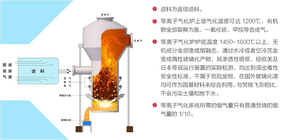 國內(nèi)外大多危廢處置企業(yè)采用的回轉(zhuǎn)窯焚燒技術(shù),并不能徹底解決危廢的無害化處置難題:揮發(fā)性金屬隨著煙塵排除形成新的污染物,非揮發(fā)性金屬則沉積在爐渣中增加了處理成本。種種現(xiàn)實難題促使人們將原本應(yīng)用于航天領(lǐng)域的等離子體氣化技術(shù),應(yīng)用到危廢和城市垃圾處理領(lǐng)域。