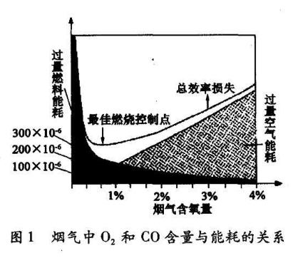 由圖1可見,“過量空氣能耗”表示富余的空氣形成的熱損失,表征為煙氣中的氧含量。“過量燃料能耗”表示由未完全燃燒的燃料所引起的能耗,表征為煙氣中CO含量。若要降低能耗,須降低煙氣中的O2含量和CO含量,但兩者是相互制約的。最佳的燃燒控制點的熱損失最小、熱效率最高,其氣體O2含量約為1%。