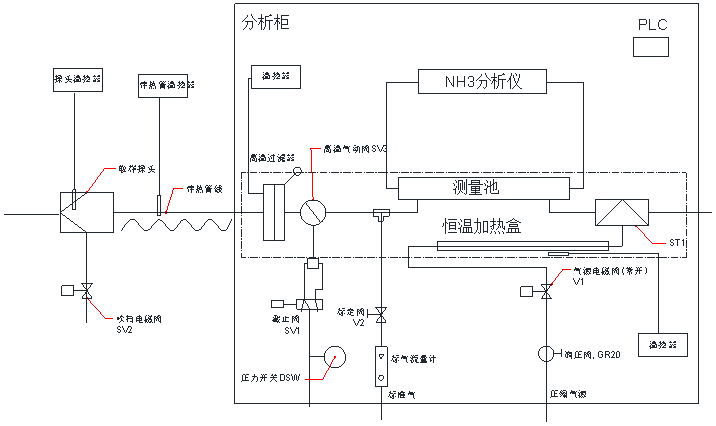如系統流程圖所示,樣氣經采樣探頭,由采樣伴熱管輸送至預處理單元,預處理單元包括常閉型高溫閥SV1,精密過濾器、射流泵,其中SV1閥用于在停止采樣時切斷氣路,精密過濾器用于進一步凈化樣氣,去除樣氣中的粉塵等,射流泵則用于提供樣氣傳輸時的動力,系統由PLC控制實際自動周期采樣及吹掃。所有樣氣流經元件及管路均置于恒溫加熱盒中,防止管路被銨鹽堵塞,減少樣氣損失。