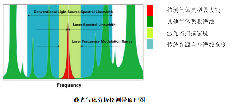 2.4.2 優點可調諧半導體激光光譜吸收技術TDLAS本質上是一種光譜吸收技術,通過分析激光被氣體分子的選擇性吸收來獲得氣體的濃度。它與傳統紅外光譜吸收技術的不同之處在于,半導體激光光譜寬度遠小于氣體吸收譜線的展寬,如上圖。因此,半導體激光吸收光譜技術是一種高分辨率的光譜吸收技術。系統采用特定波長的激光束穿過被測氣體,激光強度的衰減與氣體的濃度滿足朗伯.比爾定理,因此可以通過檢測激光強度的衰減信息分析獲得被測氣體的濃度。采用半導體激光吸收光譜技術的激光氣體分析儀可從原理上抗背景氣體的干擾,測量結果可靠性高。