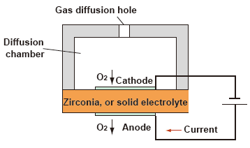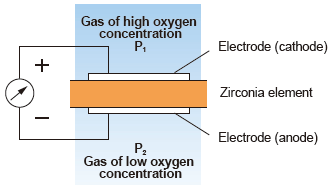 如圖所示,當多孔時鉑電極附著在兩者上,氧化鋯元素的側面加熱和不同部分的氣體氧氣濃度被帶入與的相應表面接觸氧化鋯是一種氧氣濃縮池。這種現象導致電動勢被在兩個電極之間產生,根據能斯特方程,確定比例氧濃度。