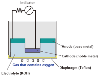 如果氧氣通過隔膜溶解在陽極(賤金屬)和陰極(貴金屬)彼此相鄰的電解液中,則產生與溶解氧量成比例的電流。通過隔膜的氧氣量與樣品氣體的氧氣分壓成比例,因此,氧氣濃度可以通過測量電流來確定。