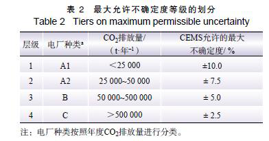 考慮到監測成本和數據質量的必要性,按年度CO2 排放量確定數據質量的層級。數據質量等級共分為4 級,排放量越少層級越低,數據質量要求也越低。在確保數據達標的情況下盡力減少企業的成本。表2 給出了各層級數據允許的最大不確定度。
