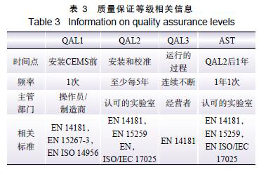 歐盟的質量控制共包含3 個質量保證級別(quality assurance levels,QAL)和1 個年度監視測試(annual surveillance test,AST),從儀器的安裝到年度的檢測, 歐盟對數據進行持續性把控,確保數據質量始終處于規定的不確定度范圍內, 及時調整儀器, 減少系統誤差。各質量保證級別測試時間、頻率、主管部門和相關標準見表3。