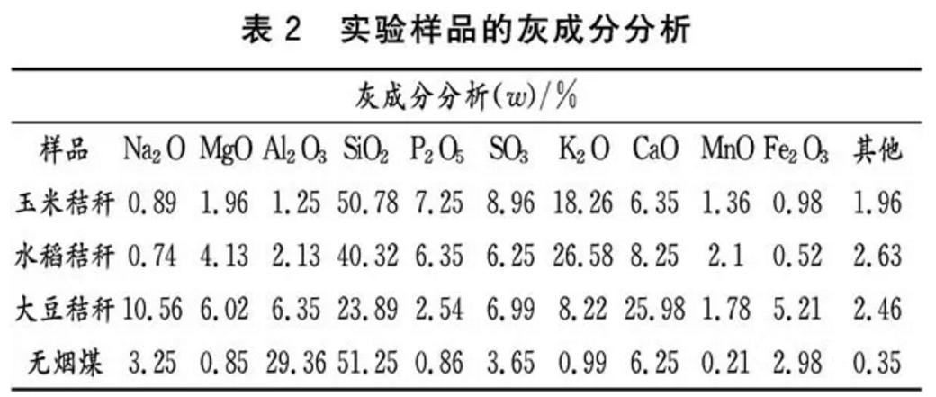 由表1可知,不同生物質的組分以及含量有較大的差異,生物質與煤相比而言,氧含量較豐富,而無煙煤中的碳含量遠高于生物質,因此,將煤與生物質共氣化可以實現元素的綜合利用。同時,生物質中含有較多的K、Ca、Na等堿土金屬元素,對于煤的氣化具有較強的催化作用。實驗樣品的灰分分析如表2所示。