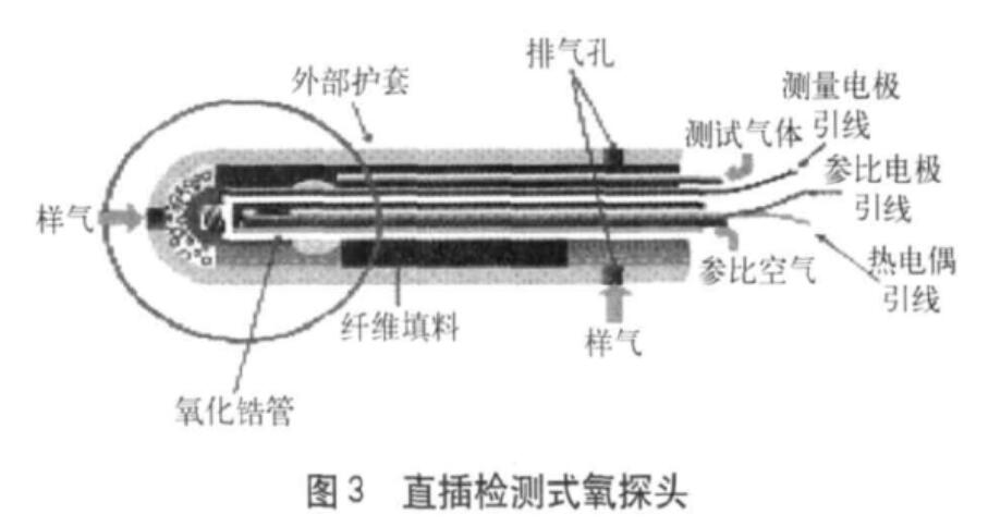 氧探頭使用時,引入被測氣體的方式有直插式和采樣檢測式兩種。直插式響應(yīng)時間短、不需要加熱器、結(jié)構(gòu)簡單、小型輕便,但要求同時檢測被測氣體的溫度。采樣檢測式由于氧探頭的溫度由加熱器控制,因此測量精度高、工作可靠,但響應(yīng)時間取決于氣體的流量。