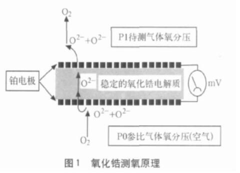 這樣在兩個電極間便產(chǎn)生了一定的電動勢,氧化鋯電解質(zhì)、Pt電極及兩側(cè)不同氧濃度的氣體組成氧探頭即所謂氧化鋯濃差電池。當(dāng)氧化鋯管處的溫度被加熱到600℃~1400℃時,高濃度側(cè)氣體用已知氧濃度的氣體作為參比氣,如能測出氧探頭的輸出電動勢和被測氣體的絕對溫度即可算出被測氣體的氧分壓(濃度),這就是氧化鋯氧探頭的基本檢測原理。