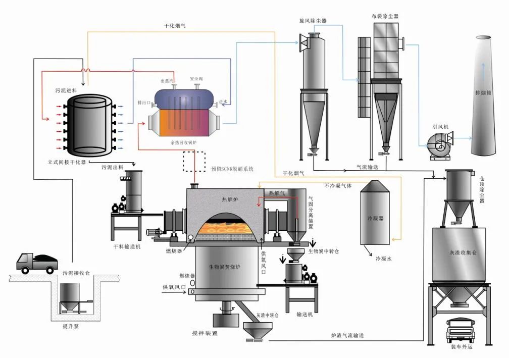 2. 脫水污泥被輸送至干化器,通過直接與熱煙氣接觸,在干化器內(nèi)實現(xiàn)加熱和干化;經(jīng)干化后的物料與一定比例的輔助燃料充分混合后進入立式清潔焚燒爐焚燒,干化后的尾氣經(jīng)尾氣處理系統(tǒng)清潔凈化后,無煙潔凈排放;