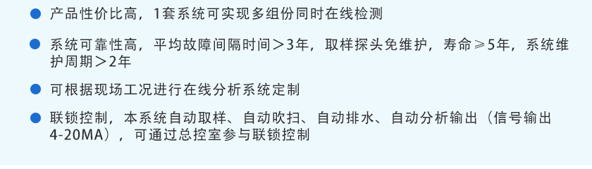 抽取式采用分析,主要應用于高爐噴煤分析、熱風爐煙氣分析、高爐煤氣分析、轉爐煙氣分析、轉爐煤氣回收分析、煤氣柜安全分析、精煉爐爐氣分析、干熄焦循環氣分析、電捕焦安全分析、焦爐煤氣分析、加熱爐優化燃燒、煤氣熱值分析、排放煙氣連續監測分析、高爐富氧系統分析。 在線紅外煤氣熱值分析系統通常采用儀表柜式或分析小屋,由取樣探頭、樣品預處理及分析儀器等組成;可在復雜工況下在線分析煤氣包括CO、O?、CO?、H?、CH?、CnHm(注:單個分析儀可分析1-6個組分)等多個參數,針對我國煤氣現場惡劣的工況條件,天禹智控自主研發紅外氣體傳感器、順磁氣體傳感器或電化學氣體傳感器、熱導氣體傳感器,水洗祛除焦油技術,
