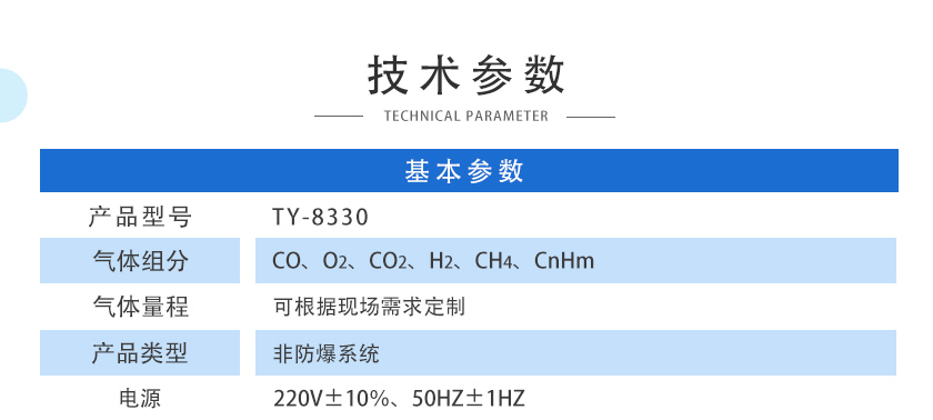 • 在線煤氣分析系統 TY-8300 TY-8300型煤氣在線分析系統是天禹智控自主研發新型在線監測系統,該產品基于非分光紅外(NDIR)氣體分析技術、長壽命電化學傳感技術以及基于MEMS的熱導技術,可同時在線測量煤氣的熱值,以及CO、CO2、CH4、H2、O2、CnHm等氣體的體積濃度。預處理系統采用冷干法設計,關鍵部件采用原裝進口,可根據現場不同的工況條件,為客戶定制解決方案,保證分析系統的可靠運行。