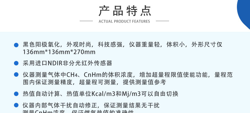 采用國際先進的NDIR非分光紅外技術,主要用于測量各種天然氣氣、生物燃氣中的CH4、CnHm?等氣體體積濃度及熱值。測量精度高、結構簡單、維護方便,軟件功能強大,可拓展性強、現場實用性好,目前暢銷國內外。適用于高校、環境科研機構,燃氣計量檢測部門、節能監測部門,液化氣廠、液化氣站、天然氣公司等直接用戶,燃氣具生產企業、廠商測量可燃氣體不同成分的體積濃度和熱值。