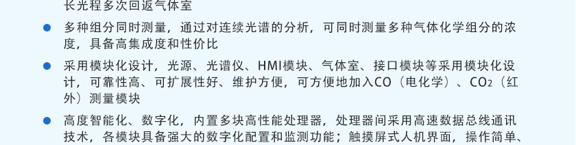 該分析儀基于紫外差分吸收光譜技術(DOAS)和化學計量學算法(PLS),能夠測量SO2、NO、NO2、O2、NH3、CO、CO2、Cl2、O3、H2S、HCl、CH3I等氣體濃度,具有測量精度高、可靠性強、運行成本低、響應時間快、量程跨度大、應用范圍廣等特點。