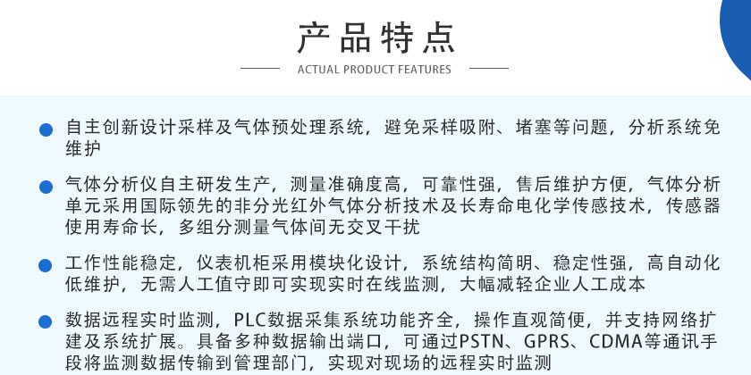 采用自主知識產(chǎn)權(quán)的NDIR非分光紅外技術(shù),主要用于測量氣體中的CO、CO2、CH4、C3H8、SO2、NO等氣體的體積濃度及熱值。全進(jìn)口傳感器、測量精度高、結(jié)構(gòu)簡單、維護(hù)方便,軟件功能強(qiáng)大,可拓展性強(qiáng)、現(xiàn)場實(shí)用性好,目前暢銷國內(nèi)外。