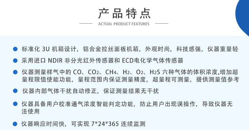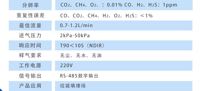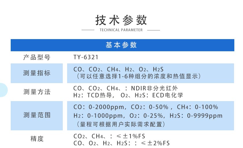 CO2、CH4、:≤±1%FS;CO、O2、H2、H2S::≤±2%FS