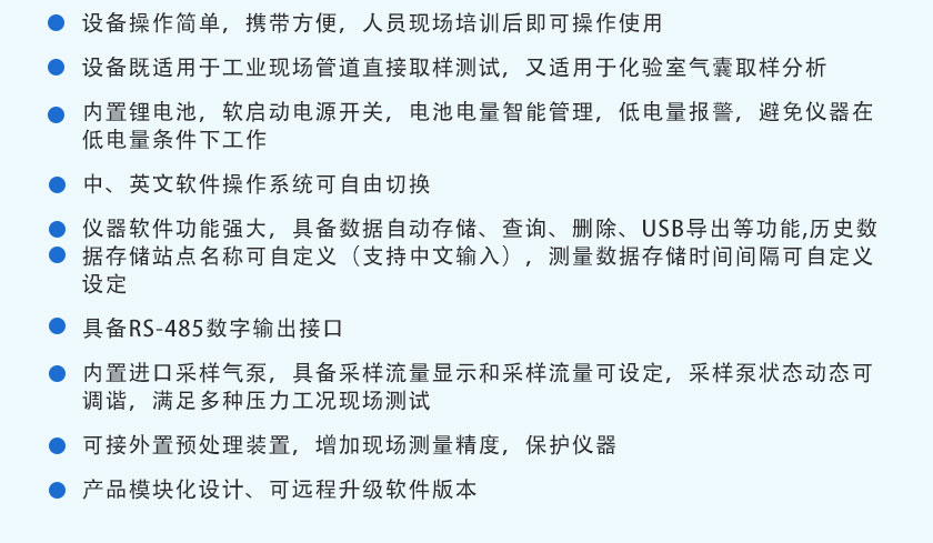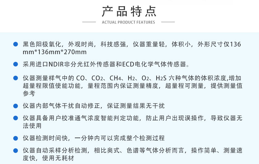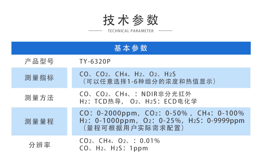 CO:0-2000ppm; CO2: 0-50%;CH4: 0-100%; H2: 0-1000ppm;O2: 0-25%;H2S: 0-9999ppm (量程可根據用戶實際需求配置)