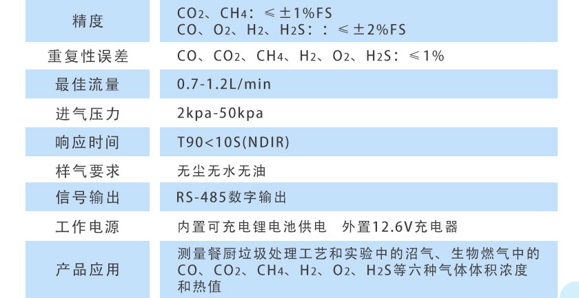 CO2、CH4、O2: 0.01%;CO、H2、H2S: 1ppm