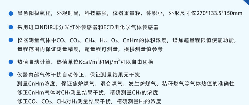 紅外煤氣成分及熱值分析儀采用進口NDIR非分光紅外傳感器,長壽命電化學傳感器和基于MEMS的熱導傳感器,運用先進的數字處理技術,可同時在線測量煤氣、生物燃氣中CO、CO2、CH4、H2、O2、CnHm等六種氣體的體積濃度,根據氣體濃度值快速準確計算出相應的熱值。