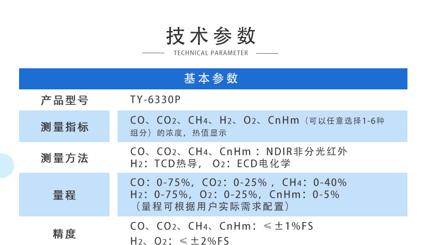 • 在線紅外氣體分析儀 TY-6300 在線紅外氣體分析儀TY-6300采用自主知識產權的NDIR非分光紅外技術,主要用于測量CO、CO2、CH4、C3H8、SO2、NO等氣體的體積濃度及熱值。適用于鋼鐵、化工、煤氣化、生物氣化、節能監測、能效測評等領域,測量焦爐煤氣、高爐煤氣、轉爐煤氣、混合煤氣、發生爐煤氣、生物燃氣等可燃氣體不同成分的體積濃度和熱值。